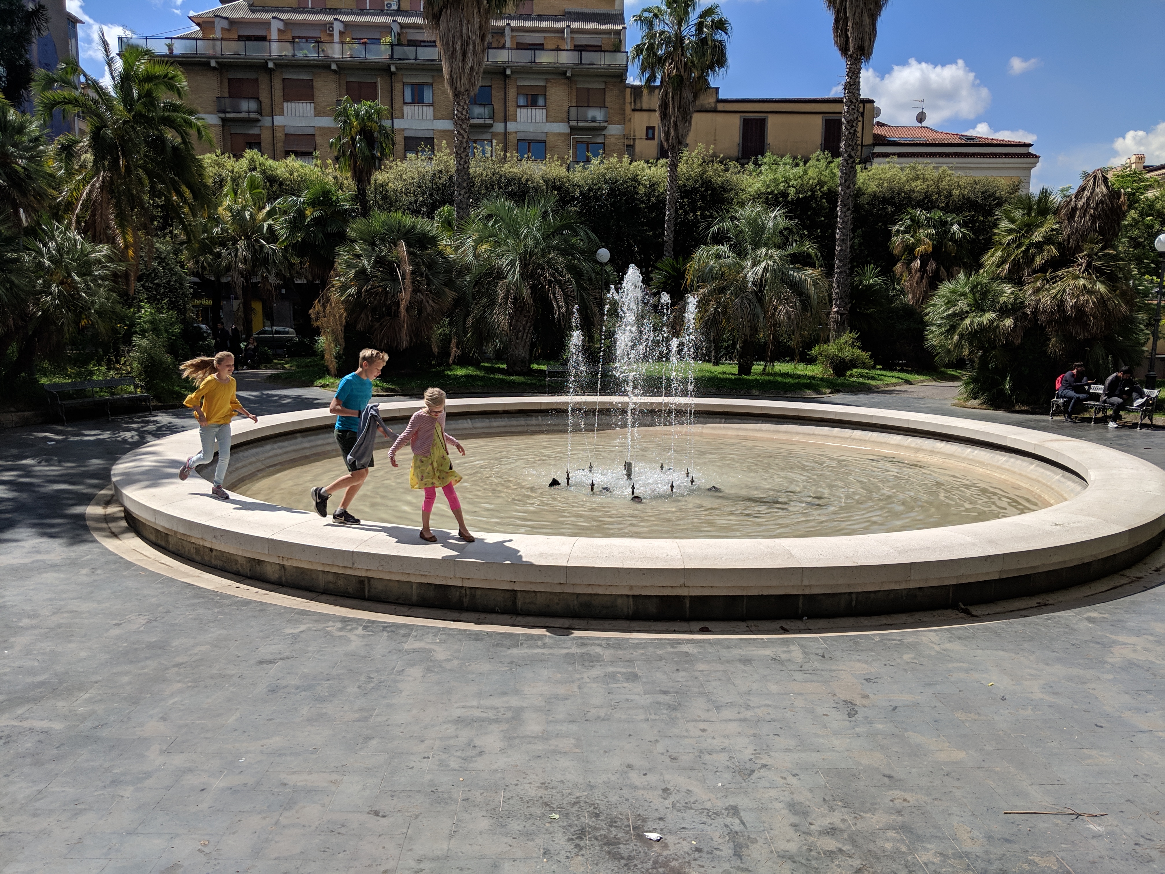 On our last day in Caserta, we visited the palace of the Kings of Naples–one of the largest royal residences in the world. It was fun to switch it up and jump ahead to the 18th century for a bit. The Italians really have a lot of marble to work with, and it shows. We were glad that Vance was able to make it with us that day, as fatigue had kept him pretty limited. The palace was ornate, but the gardens were also vast and built to impress. Eve had a moment of adventure there in those green, deceiving distances. Vance and I mistakenly let her walk alone along down the long, long path to meet up with me–she got discouraged by the distance and worried. Two Italian policemen picked her up and scooted her up to me, which gave us all the adrenaline rush of the day. The policemen couldn’t really speak English, but they were very kind. When I scooped Evie up, they just kept looking at her and saying, “Don’t cry, it’s okay, don’t cry.” They waved and honked at us later when we ran across them on our way back home. That makes Eve the only one of us who has ridden in the back of an Italian police car. For now.