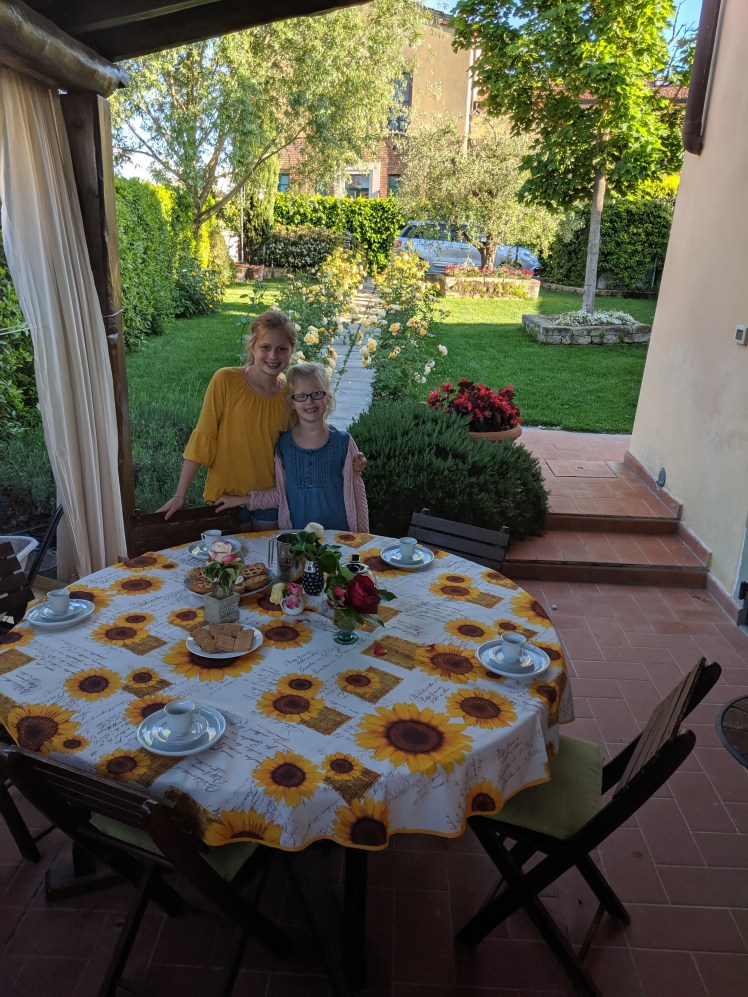 We found a steal of a deal for an agritourism stay about an hour outside Florence. It was time for us to get the kids out of the city, so we took the train to Florence, then rented a car and drove out to Castelfiorontino.I typically deal with a certain amount of pessimism on travel days. The kids are really good travelers, truly, but there’s a lot of being on time and schlepping bags and getting resettled. I started to wonder if the place we had booked could be as nice as it looked. Maybe we would be bored. Maybe we would be in the only ugly part of Tuscany. Maybe I hadn’t planned well enough. (That’s a frequent concern of mine, since I cannot reasonably keep up with the research I might normally do for a shorter trip.)As we navigated our way out of Florence, my fears began to subside. The rolling hills, dappled sunlight, cypress allees–it was lovely. Eve kept asking me about our house, though: would we have a yard? Would we be in the country?We drove up a gravel drive to a gate festooned with climbing roses. Our hosts greeted us warmly, and without much English at all–we navigated with our limited knowledge of one another’s languages, hand motions, and Google Translate.What needed no translation, however, was that the ladies were warm and hospitable. They had a fire cracking on the wood stove to drive away the chill of the day. Cinzia and Katia left us a couple bottles of their homemade wine, as well as a bottle of olive oil from their orchard. We were in good hands.Castelfiorontino was for us a place of true rest. Outside, the kids played bocce and ping pong, and inside we curled up next to the fire. We did a little school and studied Renaissance art. I took some nice long walks and cleared my head. Vance was wiped out for the first couple of days, which was challenging emotionally. It’s just hard to feel bad, as obvious as that sounds.I didn’t have much of a kitchen in Rome, but our situation in Tuscany was much more friendly. I had fun buying all kinds of cheeses that I had never heard of. We had bruschetta and frittatas, fresh pasta with pesto, chicken cacciatore, Tuscan melon and of course a lot of Nutella. I love to cook, but my real life at home is busy, and I’m often falling back on basics for meals. Getting to experiment in the kitchen was rejuvenating.We had planned to take a day trip to Florence in the middle of the week. Because of the crowds and Vance’s health, we had pre-purchased our tickets to the Uffizi. Wednesday came, though, and Vance wasn’t well. We had hard decisions to make–should I try to drive the (manual) car down to the train station and take the kids by myself? Should we forfeit our tickets and hope for a better day for our family? It feels frustrating to be close and yet out of reach.Ultimately, we decided to wait for a better day, and it was freeing to remember that one of our true priorities has been rest for Vance. It brought clarity for me in a day that had started out feeling very frustrating and disappointing. It was good to remind my Type A-see-all-the-things personality that we could just enjoy what we had right where we were. And there was so much to delight in.Vance improved over the week, and we for make our day trip to Florence later on the week. But my memories of Tuscany will be mostly of the rest we fought for and found and enjoyed.