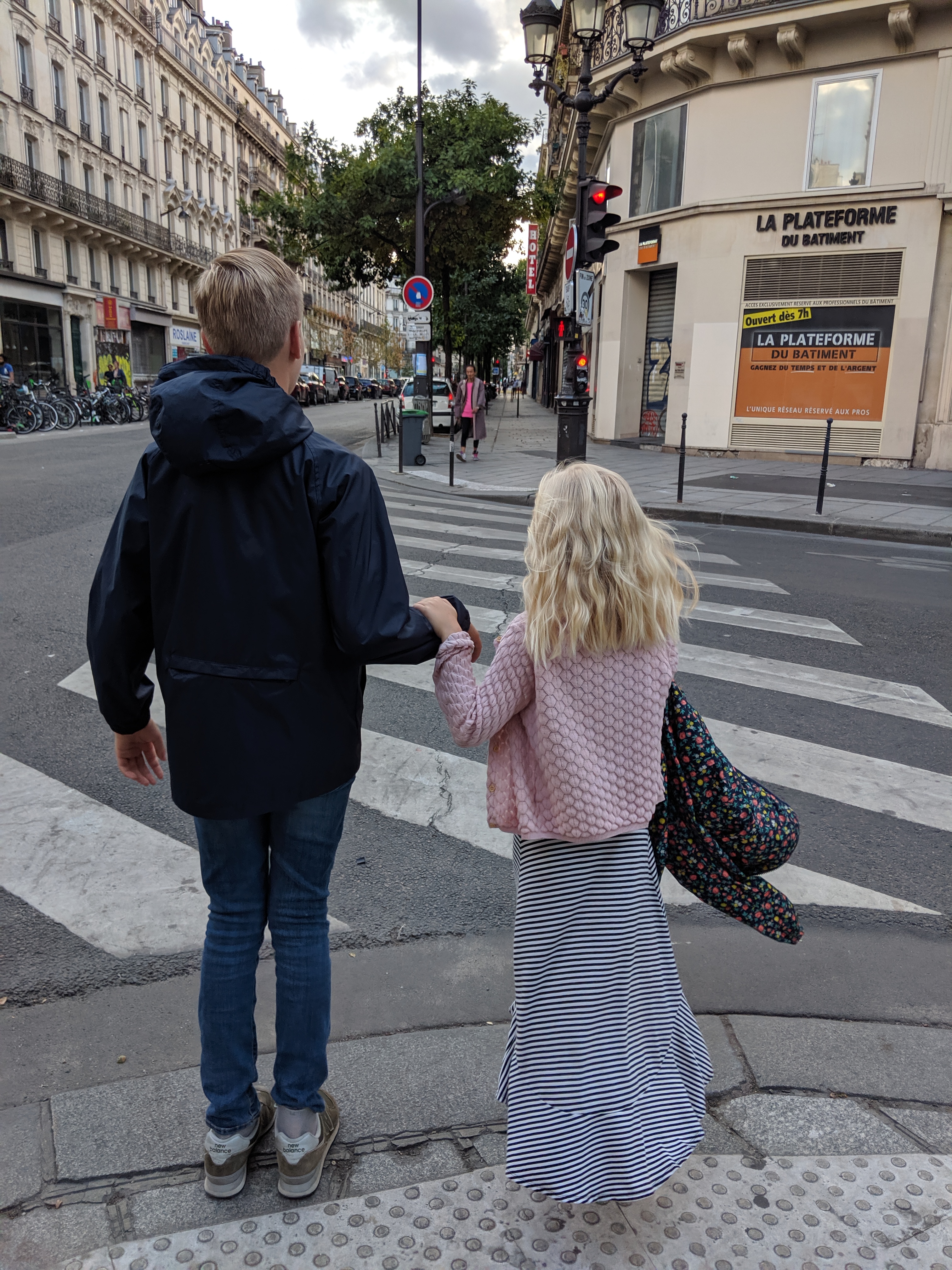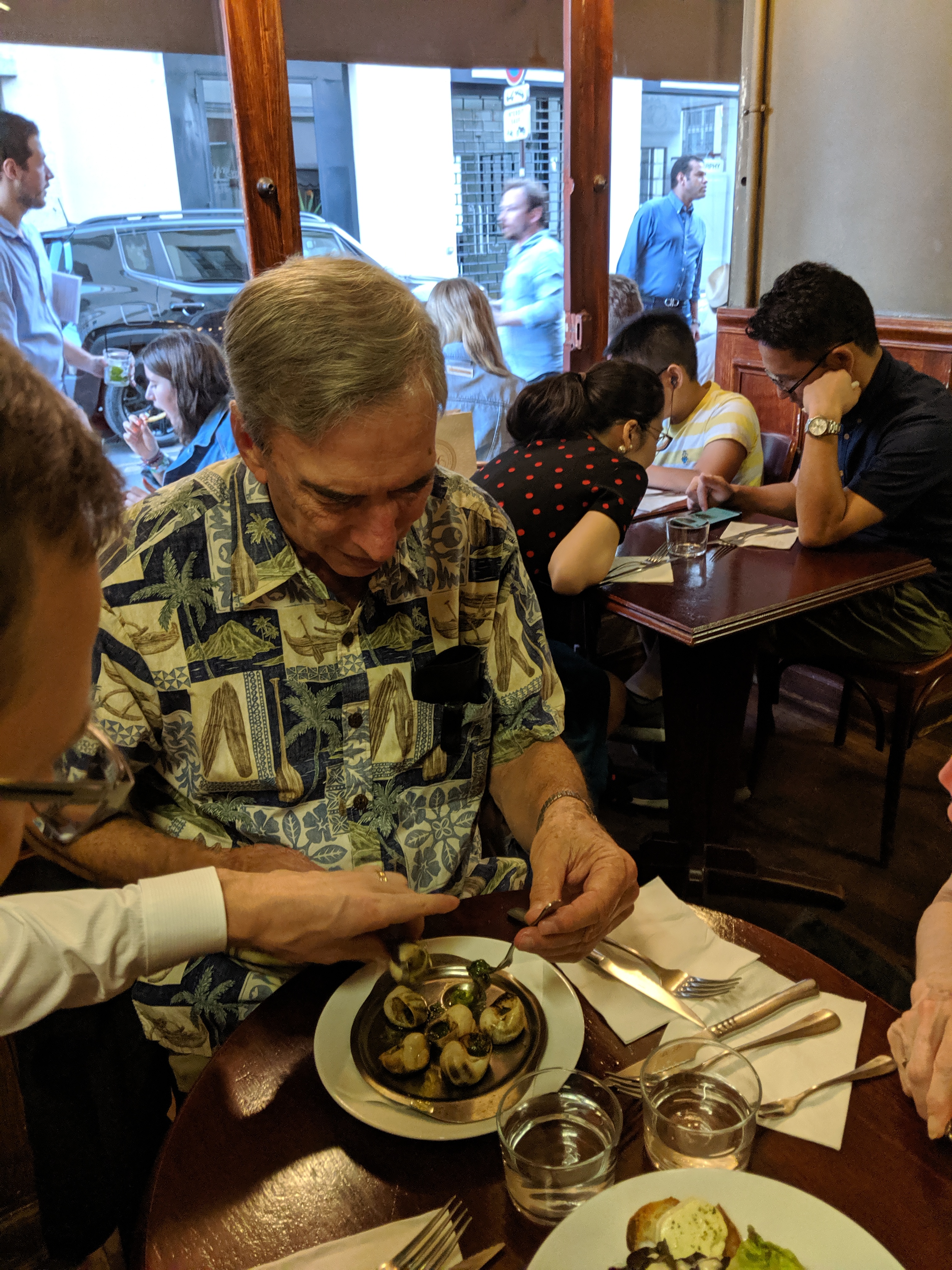 That evening, we took Vance’s parents our for a French bistro dinner. Isaac turned his gentleman on and escorted Eve all the way to the restaurant. The kids were very invested in serving their grandparents escargot, which they sampled with a good will. We had entrecote and duck confit and lamb and salad with chevre toasts and profiteroles–so many classics.